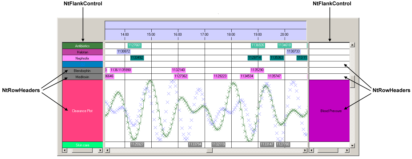 A NtRowHeader makes up the legend for a Time Chart row. A Row Header is placed within a NtFlankControl. This
