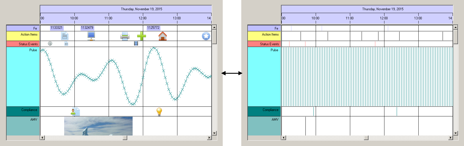 On the right you can see the condensed view: The data objects are represented by a thin vertical line located at the time stamp of the data object. The thin line covers almost the full row height. The