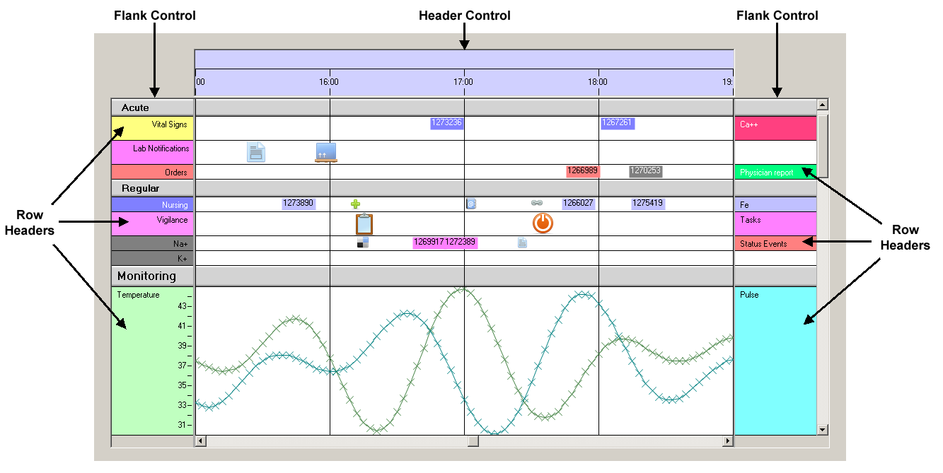 Row Headers are rectangular labels located inside the Flank Control aligned with the rows of the Time Chart. A Row Header is not specific for a row but for a data type that is in a row. If there are more than one data