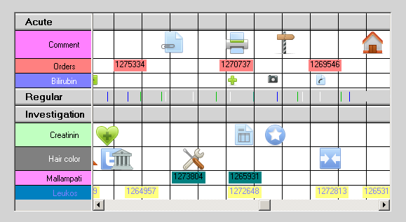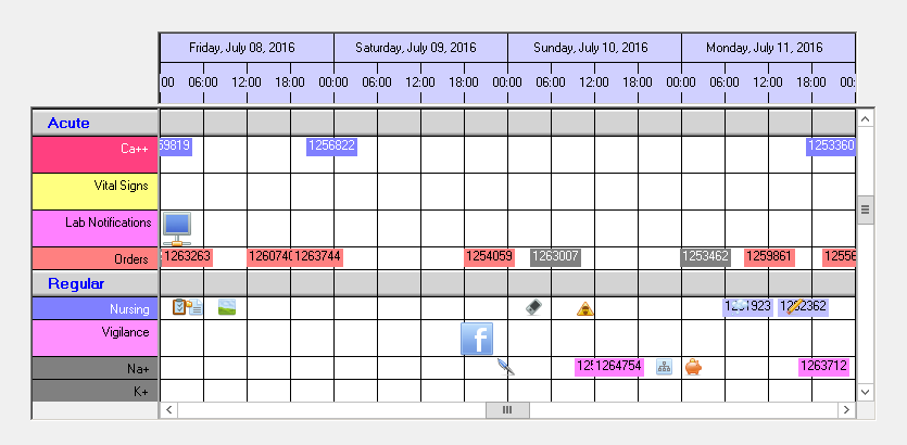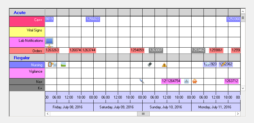 An example with categories 'Acute' and 'Regular', the time scale is located at the bottom (having the group texts below the column names).