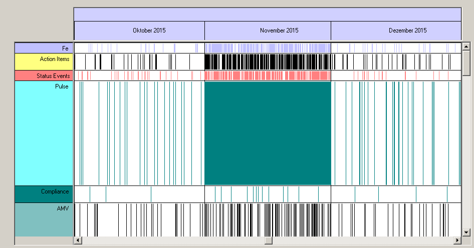 A Nateo Time Chart Control with two Flank Controls (left and right), a Header Control (on top) and scroll bars. The rows are grouped into categories.