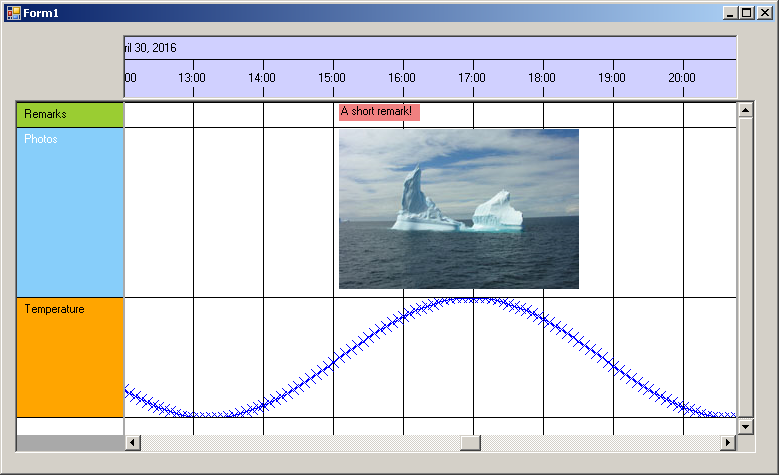 You can now try some features of the Time Chart: Tooltips on the data objects, scrolling, changing the row order (by pressing Ctrl and drag the Row Headers vertically), change the time scale zoom (by