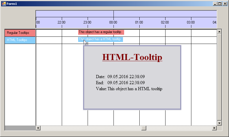 There are two types of tooltips that are supported by the NtTimeChartControl: Regular tooltips and HTML tooltips. HTML tooltips are HTML pages rendered by a browser control.